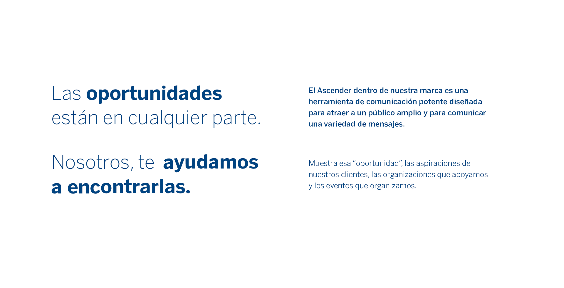 El Ascender es el asset que da imagen a las oportunidades que se presentan en la vida de nuestros clientes y a la vez es la representación de BBVA. El Ascender dentro de nuestra marca es un asset de comunicación potente diseñado para atraer a un público amplio y para comunicar una variedad de mensajes. El Ascender es un elemento visual de marca exclusivo de BBVA. Puede adaptarse y utilizarse de diferentes maneras para diferentes comunicaciones.